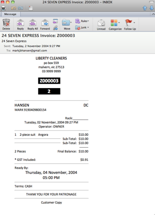 A man walks up to the cleaners at 7pm, carrying a bag of soiled garments. He takes his credit card out of his pocket, inserts it into the machine in front of the store, without a word the man drops the bag into the box. At the same time the door on the face of the machine quietly opens, he reaches in and takes his cleaned and pressed garments from the hook, from a previous order, gets his card and heads home. The door automatically closes and locks behind him the instant he removes his garments.
